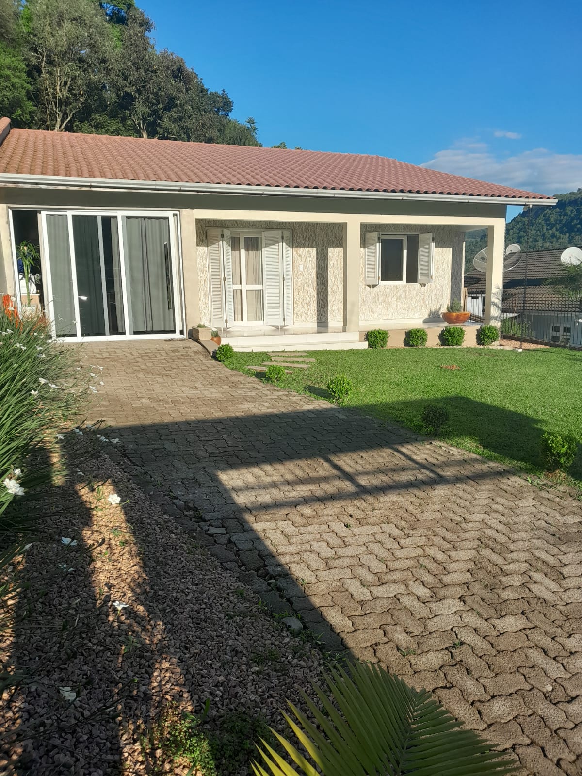 • a casa é composta de= 3 dormitórios, sala de estar/jantar, cozinha, banheiro montado e uma vaga coberta de garagem com portão eletrônico. Nos fundos tem um espaço coberto com churrasqueira, área de serviço e mais um local aberto para lazer.